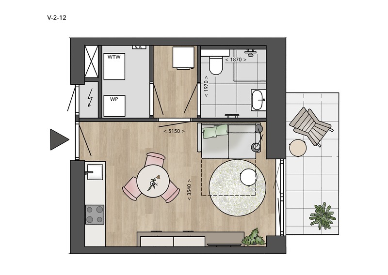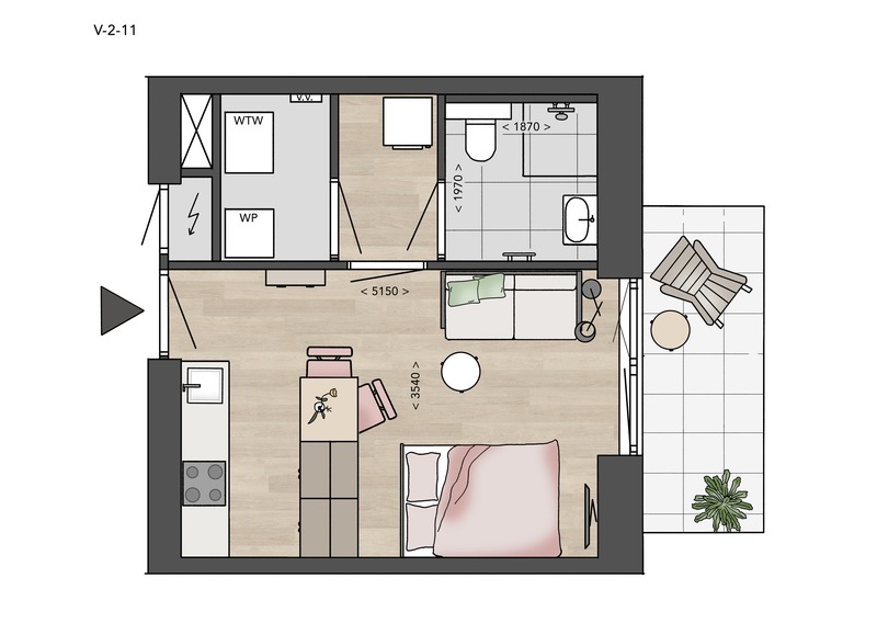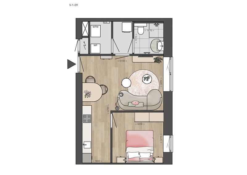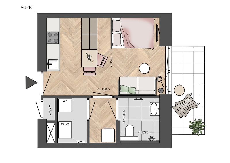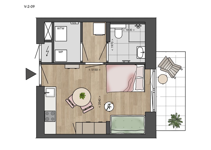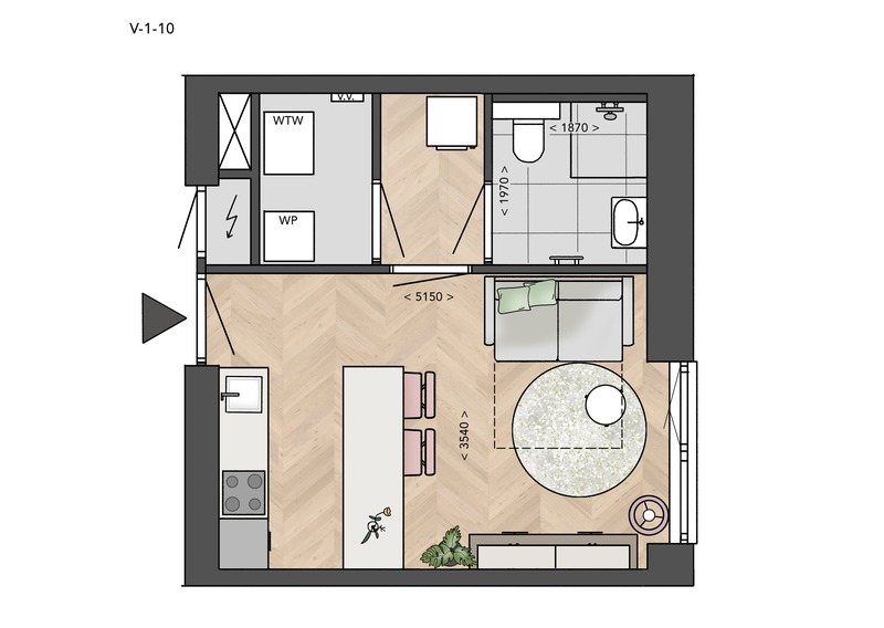 Alle Petite-appartementen in deze fase hebben een woongedeelte met open keuken, badkamer met toilet en technische ruimte voor je wasmachine en droger. Twee fietsen kun je kwijt in de gezamenlijke fietsenstalling in de kelder. V-2-09, V-2-10, V-2-11 en V-2-12 hebben bovendien een eigen terras op het zuiden, voor als je zin hebt om in het zonnetje te zitten!